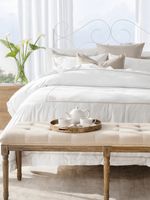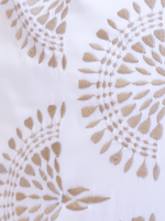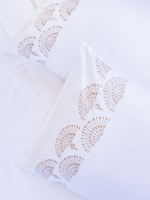 Infuse your bedroom with the elegance of ancient-inspired design with the Moana White Duvet Cover Set. Made from luxurious 300 Thread Count cotton sateen, this set features a crisp white base adorned with striking fan-like patterns in a rich, solid gold outline. This fabric blend ensures durability while maintaining a soft touch, making it an excellent choice for everyday use.
