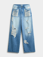 Discover the ultimate denim statement piece with our Mid-Wash Extreme Ripped Wide Leg Denim. Made from premium denim fabric. Perfect for any occasion, this denim is a wardrobe essential.