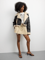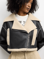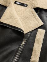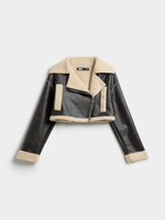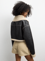 Stay warm in style with our Black Bonded Sherpa Crop Jacket. Made from high-quality PU fabric for a cozy feel. This jacket features a trendy crop length and a soft sherpa lining for extra warmth. Perfect for any casual outfit.