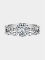 Expertly crafted in 9ct White Gold, this romantic twinset ring features a round-cut Diamond in a double halo setting and intricate vintage-style bands sparkling with yet more fine-cut stones.