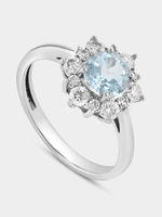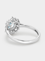 Expertly crafted in 9ct White Gold, this beautiful ring features a round-cut Sky Blue Topaz embraced by a snowflake-inspired halo of round-cut Lab Grown Diamonds. The total Diamond weight is 0.57 carats.