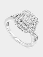 Expertly crafted in 9ct White Gold, this opulent ring features an emerald-shaped cluster of baguette-cut and full-cut Lab Grown Diamonds in a double halo setting and an elegantly twisted band glittering with single-cut stones. The total Diamond weight is 0.76 carats.