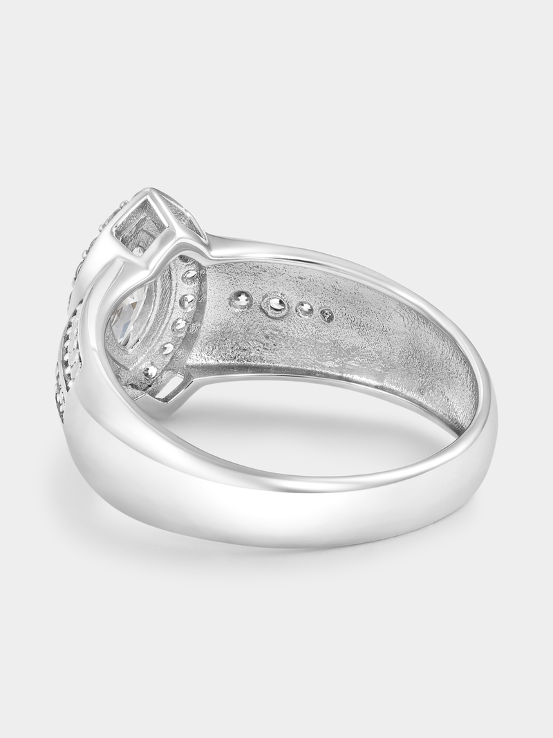 Expertly crafted in 5ct White Gold, this beautiful ring features a marquise-cut Cubic Zirconia in a halo setting and an intricately beaded band glittering with pavé set stones.
