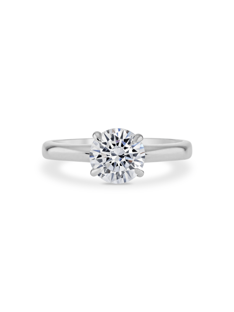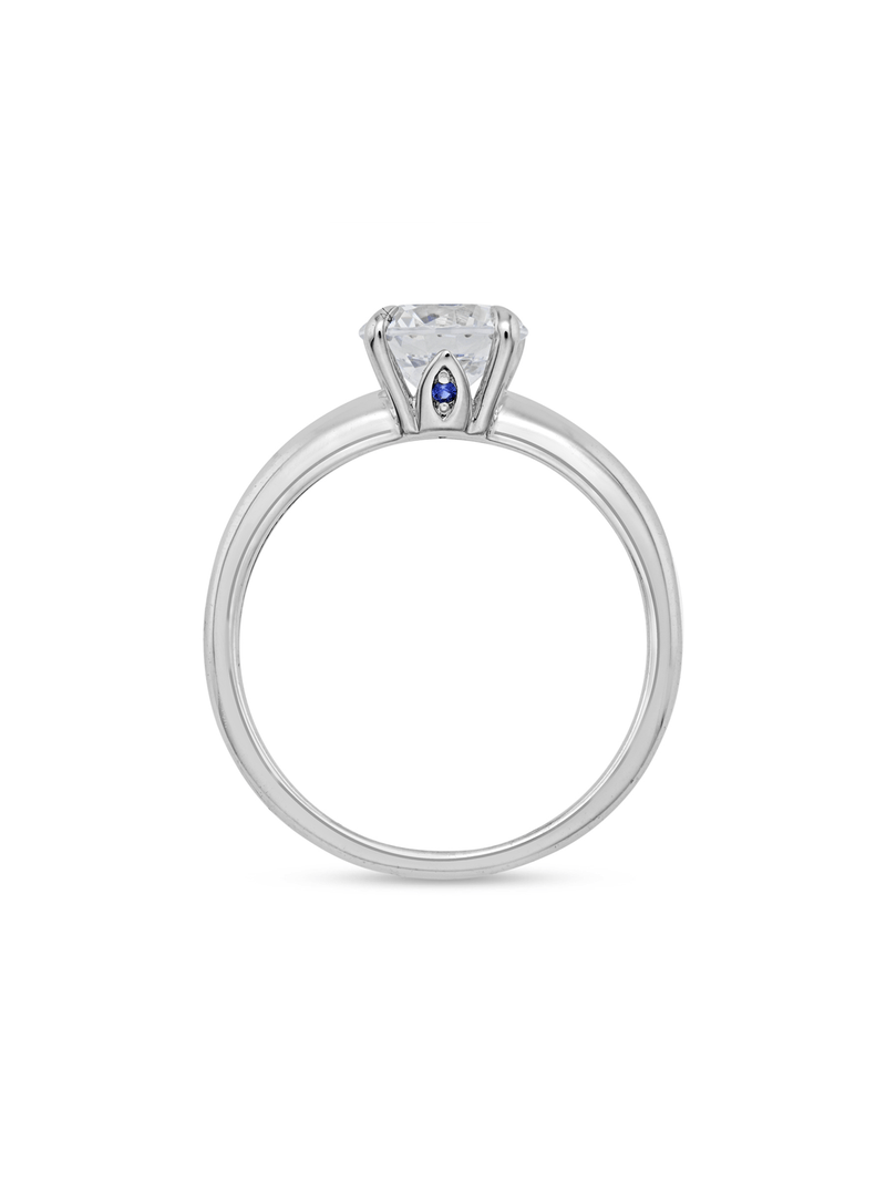 Expertly crafted in 9ct White Gold, this beautiful ring features a round-cut 1.5ct Moissanite solitaire in an iconic 4-claw setting. A created blue Sapphire set in a flame-shaped embrace enhances the ring’s gallery, symbolising eternal love, truth and faithfulness.