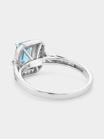 Expertly crafted in 9ct White Gold, this vintage-style ring features an emerald-cut Sky Blue Topaz embraced by a double halo of round-cut Created White Sapphires including Earth Grown Diamond accents and an intricately beaded band. The total Diamond weight is 0.006 carats.