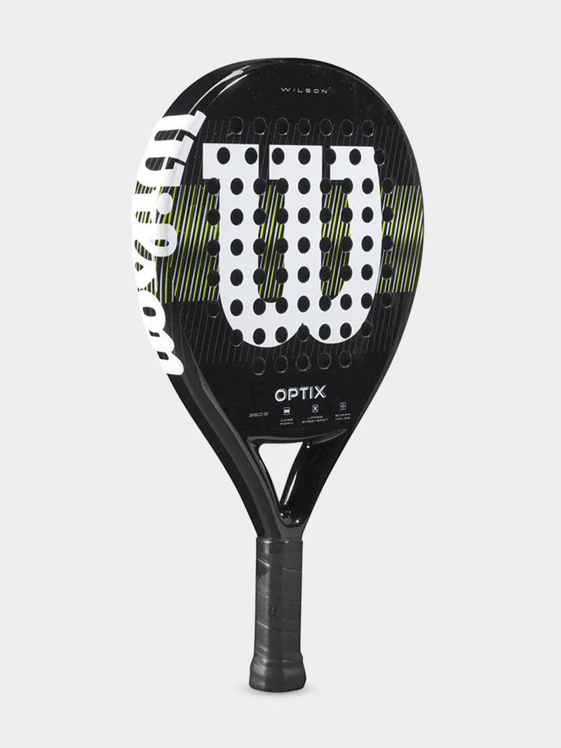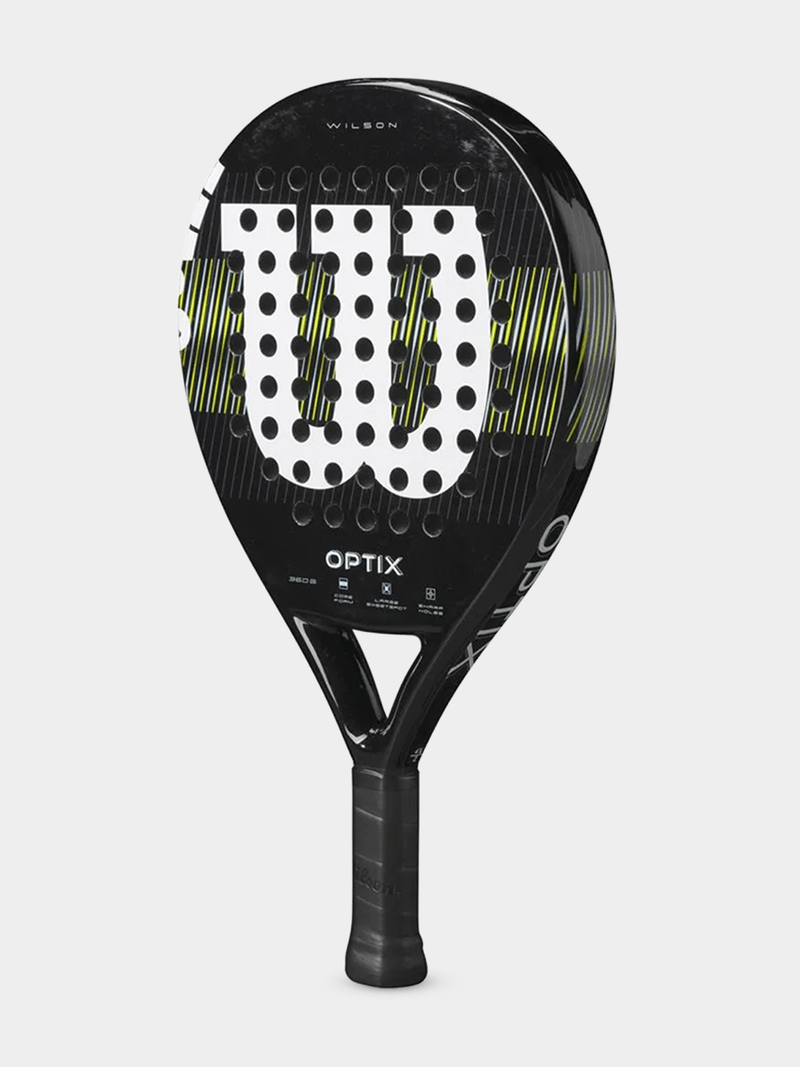 An excellent starter racket, the Optix V1 Padel Racket is easy to pick up and start playing. Beginners will feel successful right off the bat thanks in part to a large head size, which gives you an increased hitting surface to help put more balls in the court. It has a woven fiberglass frame for a stable yet responsive feel with a low-density foam core that can hit with power but still feels soft. The round shape is ideal for making consistent contact, and the advanced hole-drilling technique increases bite with every stroke. Jump into the sport using Wilson’s highly accessible Optix V1.