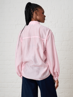 Embrace effortless charm with this Soft Pink Bellow Sleeve Drawstring Shirt. Its sheer fabric and oversized fit create a breezy, playful vibe, while the longer length and long bellow sleeves add a touch of drama. Perfect for layering or wearing solo, this shirt brings a fun, flirty twist to your wardrobe.