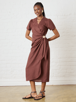 The Cocoa Shell Linen Wrap Dress brings playful elegance to your wardrobe with its rich chocolate colour and flattering midi length. Featuring short sleeves and a comfortable regular fit, this wrap dress is perfect for sunny days and casual outings. The charming gold shell detail adds a whimsical touch, making every moment feel a little more special.