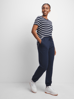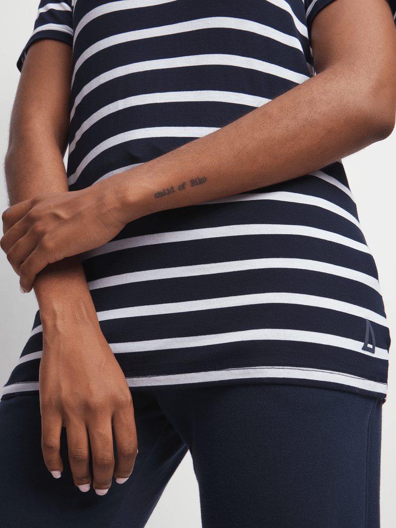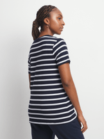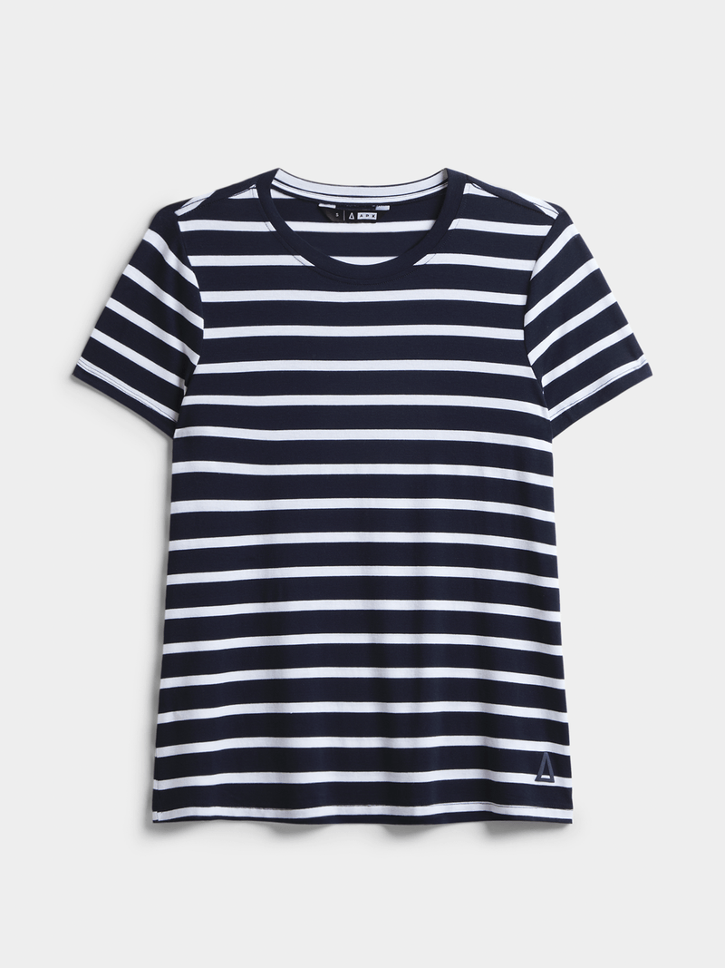 Elevate your wardrobe with our APX Essential Navy Stripe Tee. Made from a comfortable cotton blend fabric, this tee is a versatile choice for any occasion. With a hint of stretch, it offers a flattering fit that moves with you. Perfect for everyday wear, this tee is a must-have addition to your collection.
