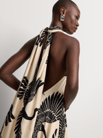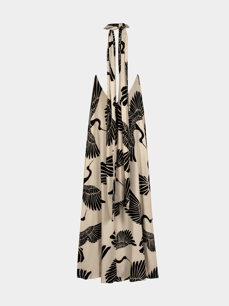 From our SS26 Babylon Collection, Origami is a soft beige base adorned with soaring deconstructed black cranes. Inspired by mythical lands and mystical beings, this print evokes the spirit of the sacred traveller, wherever she may wander.