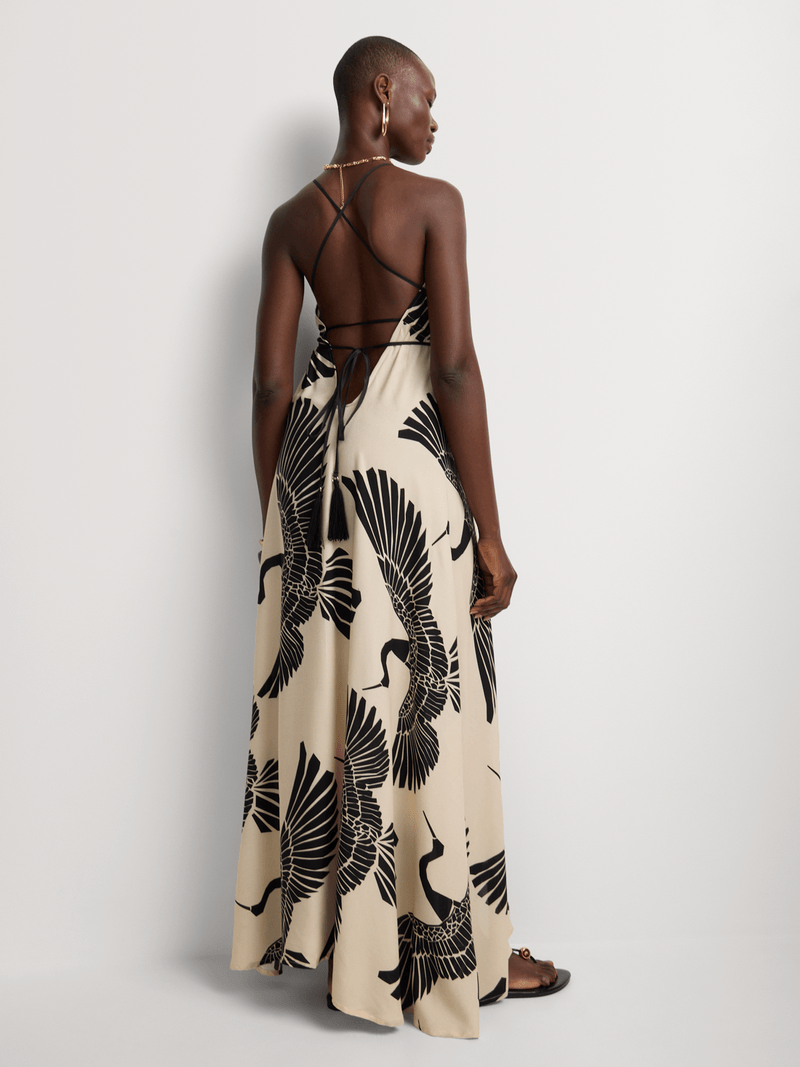 From our SS26 Babylon Collection, Origami is a soft beige base adorned with soaring deconstructed black cranes. Inspired by mythical lands and mystical beings, this print evokes the spirit of the sacred traveller, wherever she may wander.