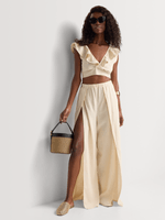 A linen dream — the Mykonos Crop Top features a soft ruffle across the bust and an adjustable tie-back for a sun-ready silhouette. The Mykonos Pants bring effortless drama with thigh-high slits that run all the way to the elasticated waistband. Crafted from breathable 100% linen in an extra-long length for barefoot beach glamour or elevated nights out.