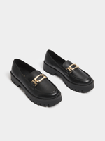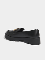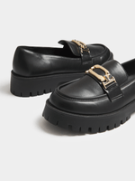 Elevate your style with these black chunky loafers featuring a sleek design and gold trim. Handcrafted in South Africa, they offer a comfortable flat heel for all-day wear. Embrace sophistication with every step in these on trend loafers.