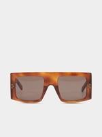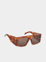 A bold, angular design and wide temples add futuristic flair to Italian sunglasses, accented with a classic thick black frame with small studs at the top corners, solid black arms and solid medium gray lenses.
