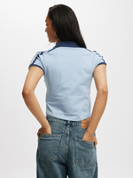 Introducing the chic and comfortable Cotton On Blue Retro Graphic Polo T-shirt. Made with a blend of recycled polyester and visco, this top features a retro graphic design with a polo style collar. Easy to care for with a cold machine wash, it's perfect for everyday wear. Upgrade your wardrobe with this versatile piece!