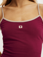 Self fabric, contrast coloured neck bind and straps