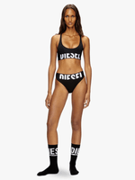 Women's sports bra in ultra-soft and comfortable microfibre, featuring removable cups and a cut-out racer back. Made with a percentage of recycled fibres, the fabric is engineered to wick away moisture and deliver a snug yet non-compressive fit. A jumbo-sized cut-off logo decorates the wide underband.