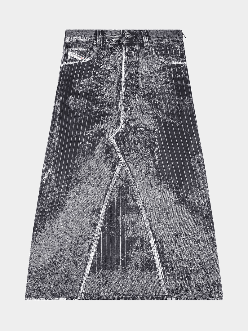 Women’s midi skirt in black stretch satin. Crafted using viscose sourced from responsibly managed forests, this style features a trompe l'oeil print that references Diesel’s pinstriped devoré-denim look from the Spring ’24 runway. It’s cut for a regular fit in an A-line shape and fastens with a discreet side zip.
