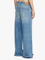 Relaxed style with a low waist, low crotch, and extra-long wide leg that showcases a '90s street attitude. Button closure. Crafted using partially recycled cotton, this fix denim fabric features a light blue wash with a clean finish.
