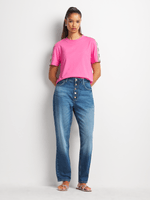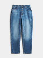 Get that effortlessly cool look with these blue exposed button mom jeans from Guess. Made from cotton with a hint of elastane, they are perfect for a cool wash and warm iron. Rock them like a model straight from Pakistan without worrying about dry cleaning. With Guess, you can always count on stylish comfort.
