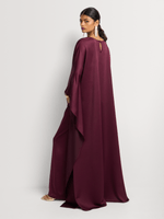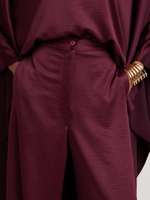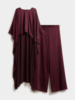 A study in sculpted ease, the IRAH set blends soft structure with fluid movement. The high-neck top features a relaxed silhouette with statement sleeves and a gentle asymmetrical drape. Paired with wide-leg trousers, this ensemble offers a quiet elegance that transitions effortlessly from day to night. Minimal. Refined. Unmistakably GIA.