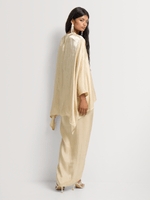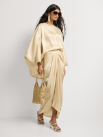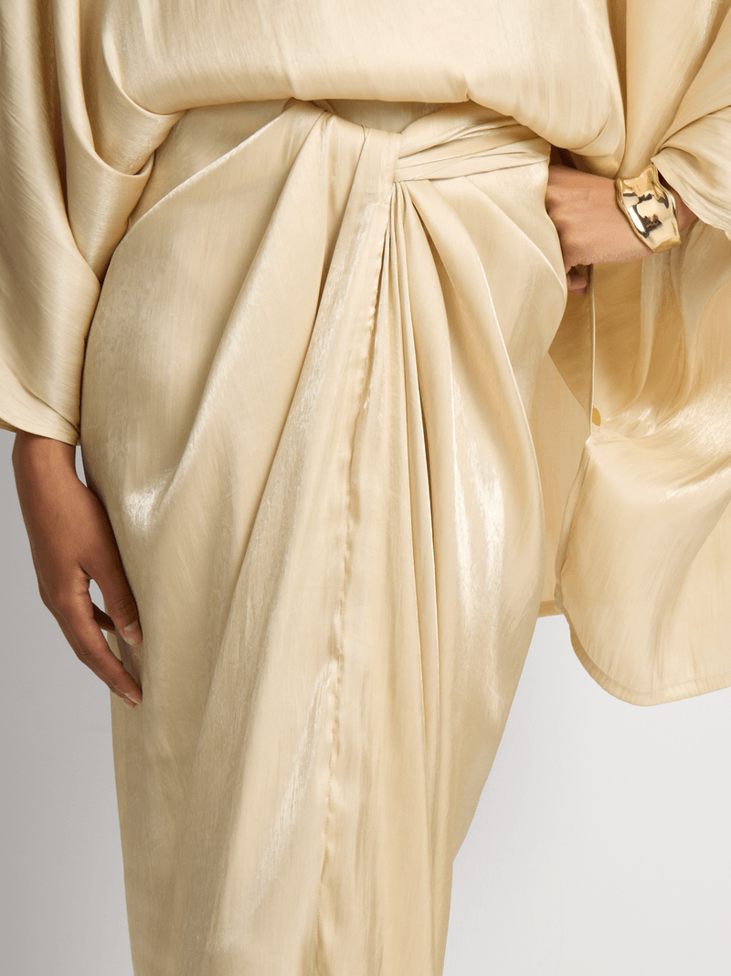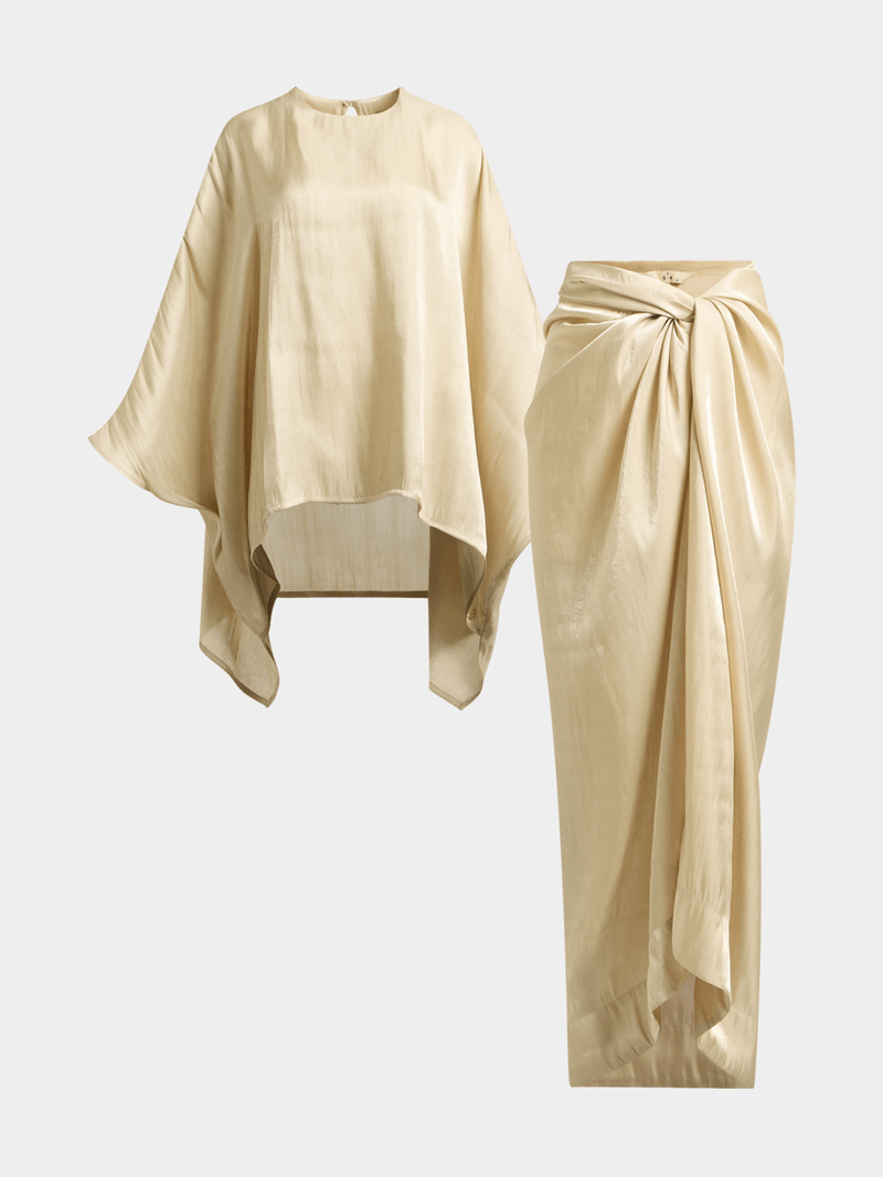 Elegant and effortlessly chic, this drapey top and shimmer satin skirt set drapes beautifully for a sophisticated look. The versatile skirt can be tied up in numerous ways, offering a customizable and flattering fit.
