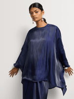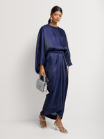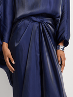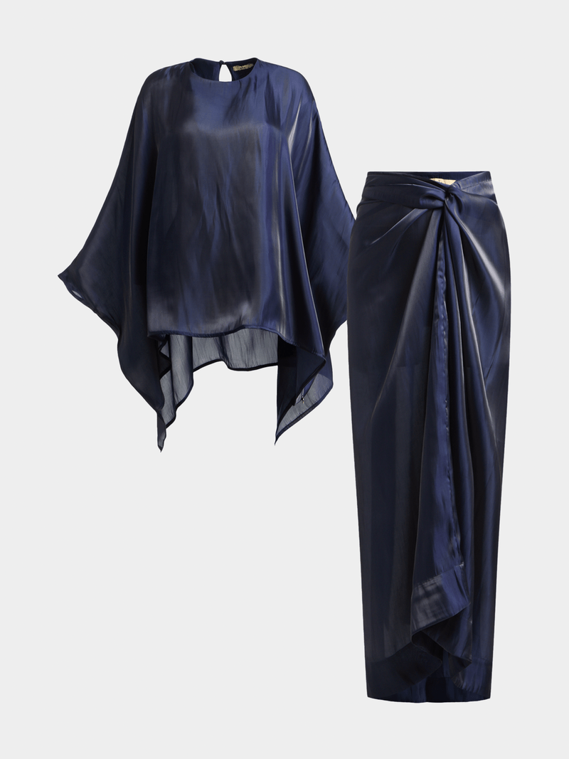 Elegant and effortlessly chic, this drapey top and shimmer satin skirt set drapes beautifully for a sophisticated look. The versatile skirt can be tied up in numerous ways, offering a customizable and flattering fit.