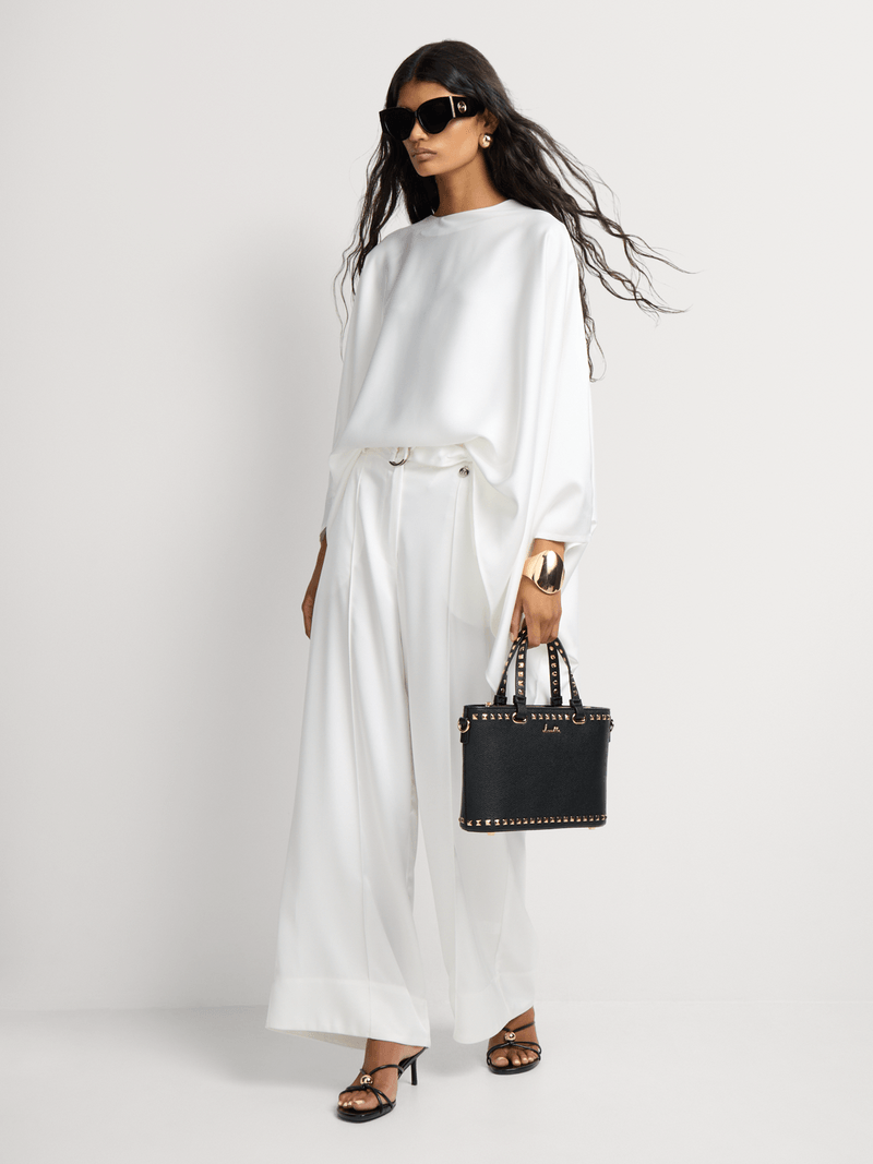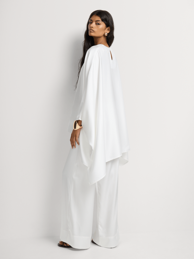 The Saara set is where fluid design meets modern refinement. This elegant co-ord features a soft, oversized top with dramatic drape and flared sleeves, paired with wide-leg trousers that flow with ease. A versatile statement in comfort dressing—polished enough for occasion wear, relaxed enough for everyday luxury.