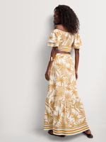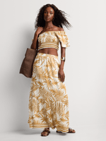 A chic two-piece set featuring a smocked cap-sleeve crop top and easy-wearing maxi skirt in shimmering gold tones. The fitted top and flowy skirt balance comfort with style, ideal for sunny occasions and resort looks.