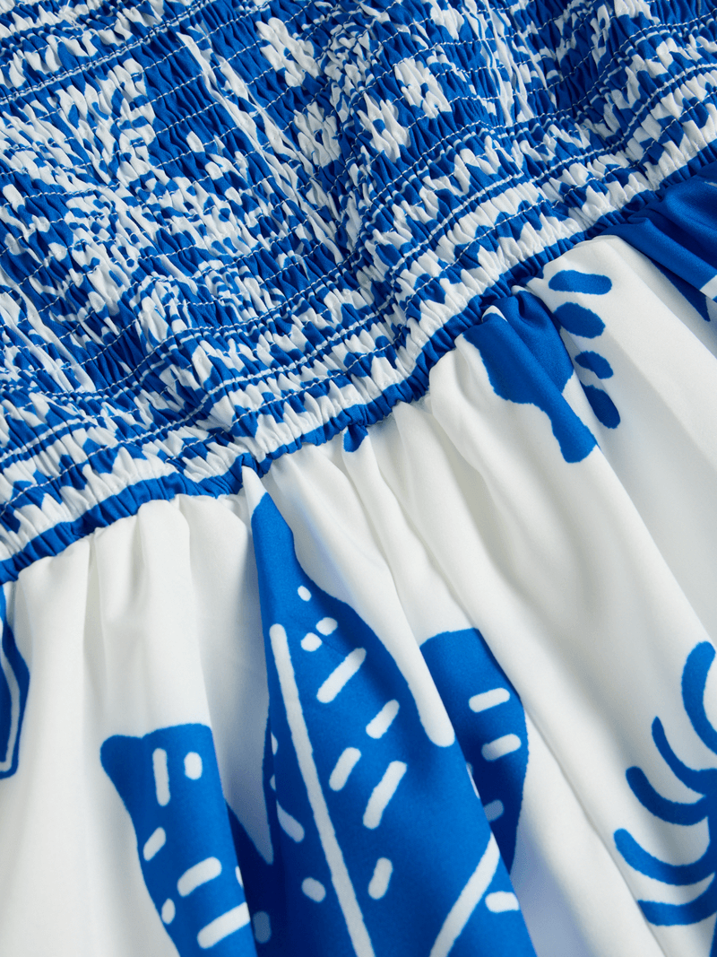 Evoking the spirit of coastal escapes, this blue and white embroidered maxi dress blends classic elegance with a carefree holiday feel. The intricate embroidery across the bodice and throughout the skirt showcases artisanal craftsmanship, while the tropical-inspired motifs add a fresh, summery vibe. With slender shoulder straps and a softly flared silhouette, it offers both comfort and grace. The maxi length creates flowing movement with every step, making it ideal for warm-weather occasions, seaside dinners, or resort getaways. Effortless, timeless, and beautifully detailed — a true statement piece for your summer wardrobe.