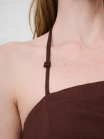 Upgrade your summer wardrobe with the Me&B Bandeau Tie Top in Choc Linen. Made from 100% linen, this trendy top features a chic tie detail and a flattering design. Perfect for any occasion, this top is a must-have for every fashionista.