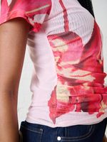 Add a splash of fun to your wardrobe with this Ruched Mesh Top in Floral . Its playful check print and slim fit hug your silhouette, while the ruched detailing adds a flirty twist. With short sleeves and a regular length, it’s perfect for showing off your style effortlessly.