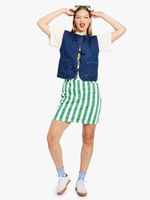 Introducing the trendy Green Printed Stripes Stretch Denim Skirt by Me&B! Made with a comfortable cotton blend fabric, this skirt features stylish printed stripes. Easy care instructions: cool wash and warm iron. Perfect for any casual occasion. Returnable via courier. Crafted for style and comfort. Get yours today!