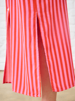 Introducing the Me&B Pink & Red Stripes Maxi Shirtdress, designed for effortless style. Made in South Africa, this dress features a collar neckline and short sleeves. Crafted from 100% viscose, it offers a cool wash option. Perfect for any occasion, this dress is sure to become a staple in your wardrobe.