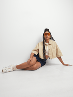 Featuring a denim fabric with an oversized crop design, ain't nothing more perfect for yo drobe. Pair it with a mini skirt, heels and a shoulder bag for a stunning fit.