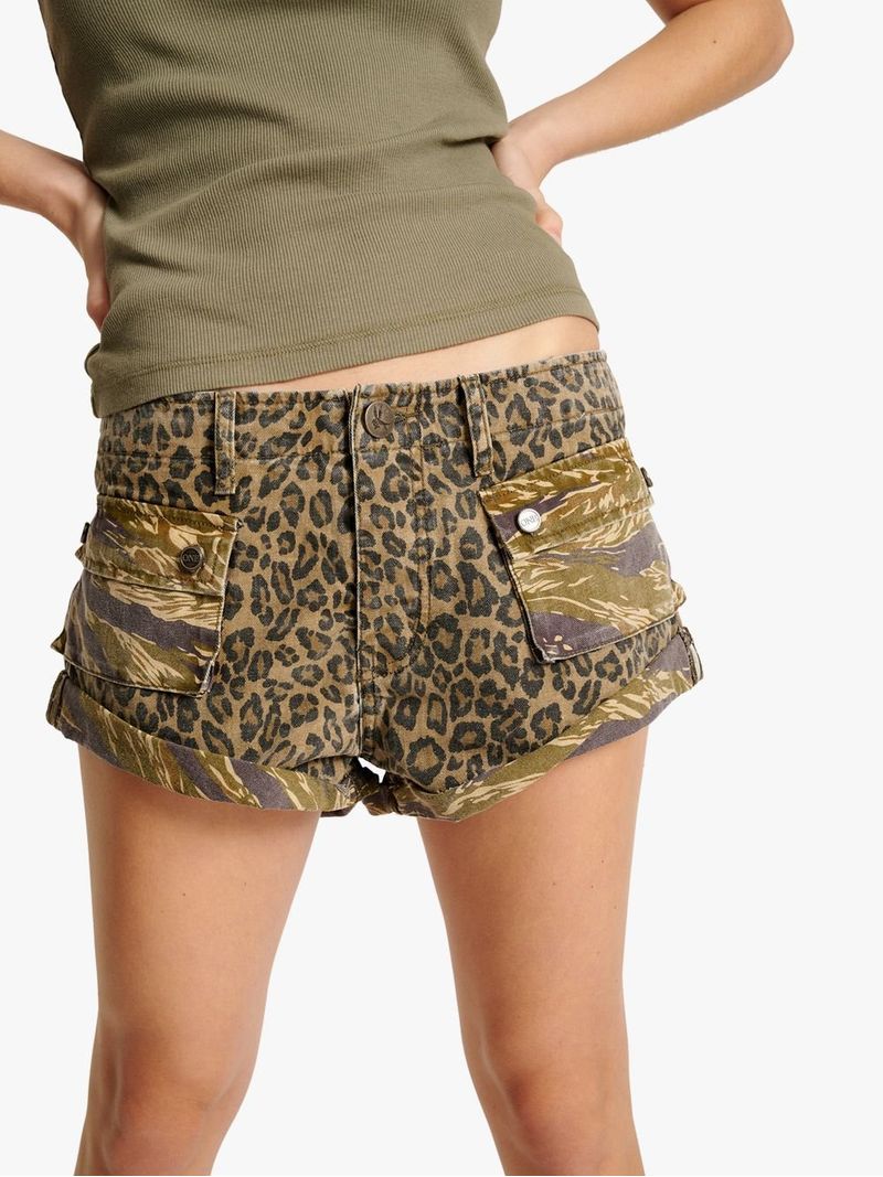 Introducing the Women's One Teaspoon Camo Low Rise Denim Short. Made from 100% cotton, this trendy short features a cool camo print. The low-rise design adds a stylish touch. Perfect for adding a fashionable twist to your wardrobe.