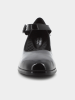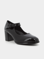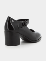 Black Mary-Jane style block heeled court shoe , with buckle closure .Step in style with Pierre Cardin . Perfect for any occasion.