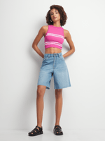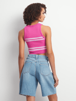 This racer vest is everything we are loving for the upcoming season. Featuring a pink & white stripe seamless fabric. Style with a cute skirt or jeans and sneakers for a fresh finish.