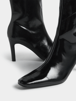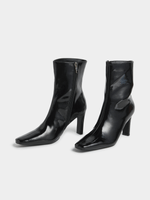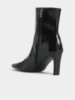 These ankle boots are perfect for those who love to stand out. With a sleek patent black finish and a unique snipped toe design, you'll turn heads wherever you go. With a confident stride and a touch of sass, these boots will elevate any outfit.