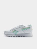 The women's Reebok Glide offers a fresh, minimalist take on the classic leather sneaker. With a clean white design accented by pops of teal, these shoes pay tribute to Reebok's heritage. They're effortlessly stylish and versatile enough to be worn with anything, from jeans to a dress, as you glide through your day.