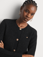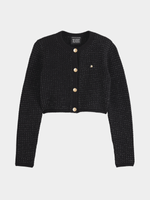 Elevate your style with the Scotch & Soda Black Metallic Tweed Stitch Cropped Sweater. Made with a luxurious cotton blend, this sweater features long sleeves and a regular fit for comfort. Perfect for any occasion, this premium brand piece adds a touch of sophistication to your wardrobe.