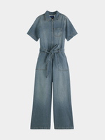 Introducing the versatile Scotch & Soda Blue Washed Denim Workwear Jumpsuit. Made from 100% cotton in Turkey, this stylish piece features a flattering fit. With a true-blue denim fabric and practical design, it's perfect for any casual occasion. Feel confident and comfortable in this must-have jumpsuit.