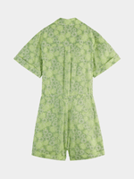 Introducing the Scotch & Soda Floral Lime Linen Utility Playsuit, a versatile and stylish addition to your wardrobe. Made from a comfortable cotton blend, this playsuit features a flattering fit and functional utility details. Perfect for any occasion, this playsuit is a must-have for your closet.