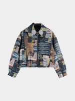 Turn heads in this unique jacquard jacket. Featuring a vibrant multi-coloured collage design, it's a statement piece that brings an artistic edge to any outfit.