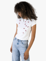 Rock the adorable look with the Sissy Boy White Heart Red Lip First baby T-Shirt. Crafted with a soft cotton blend fabric, this tee features a cute heart and lip design. Easy to care for with cool wash and warm iron instructions. Made in Mauritius. Perfect for adding a playful touch to your wardrobe.