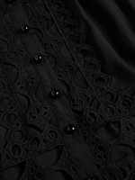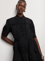 Graceful and romantic, this black broderie anglaise dress captures timeless femininity. Beautifully crafted with intricate embroidery and delicate lace inserts, it embodies soft sophistication. The high neckline and mid-length sleeves add a refined touch, while the tiered skirt creates gentle movement and volume. A self-tie belt cinches the waist for a flattering silhouette. Effortlessly elegant for daytime occasions, garden parties, or relaxed summer gatherings, this dress offers a sense of easy luxury in every detail.