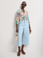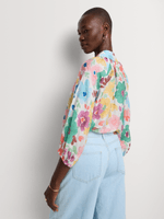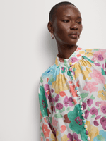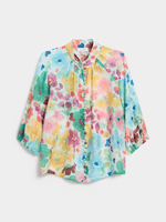 A vibrant celebration of colour and artistry, this floral button-down blouse brings joyful energy to your wardrobe. The painterly print, featuring soft watercolour blooms in shades of blue, pink, yellow, and green, evokes the freshness of spring.
