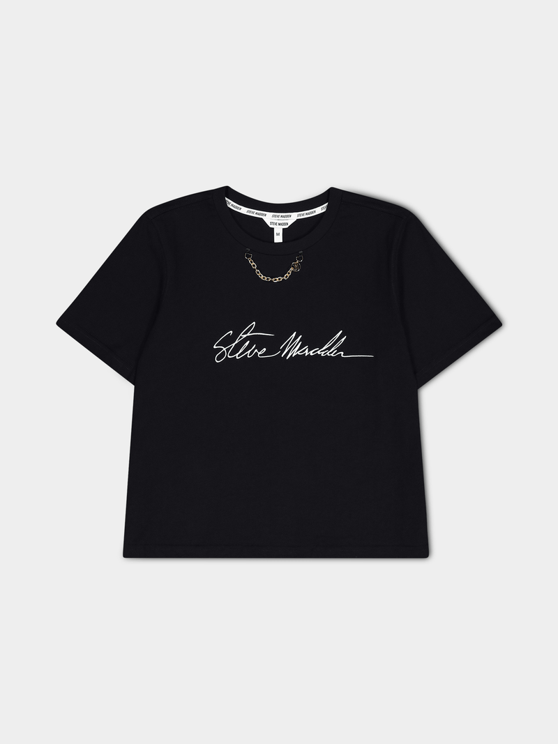 Add a stylish staple to your wardrobe with the Steve Madden Black Theresa Regular T-Shirt. Made from 100% cotton, this tee is both comfortable and versatile. Easy to care for with hand wash instructions, perfect for everyday wear.