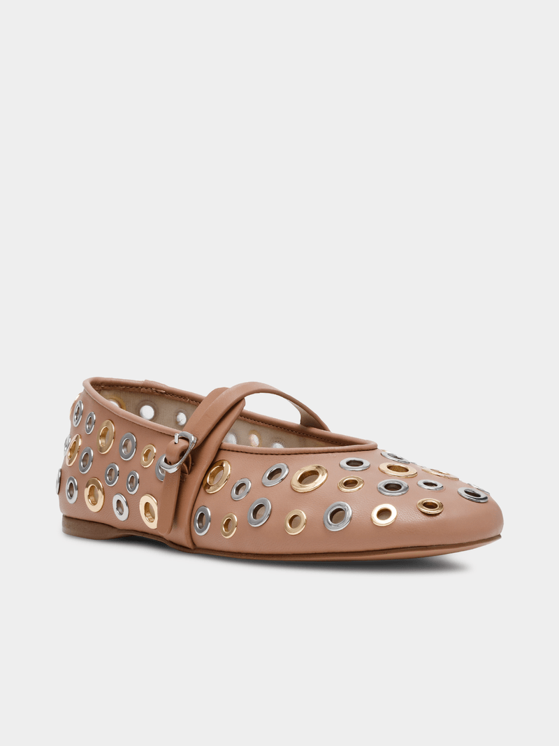 REJOICE is the statement ballerina that will take your styling game to the next level. With multi-color metallic grommets & a stylish buckle strap - she is a must have in every fashion girly's closet.