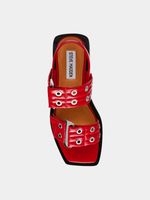 The Saria sling back flat have a super angular silhouette with a square back and a snipped toe. Chunky grommets and oversized buckles give an edge to the wide straps over the top and the toe of this design.